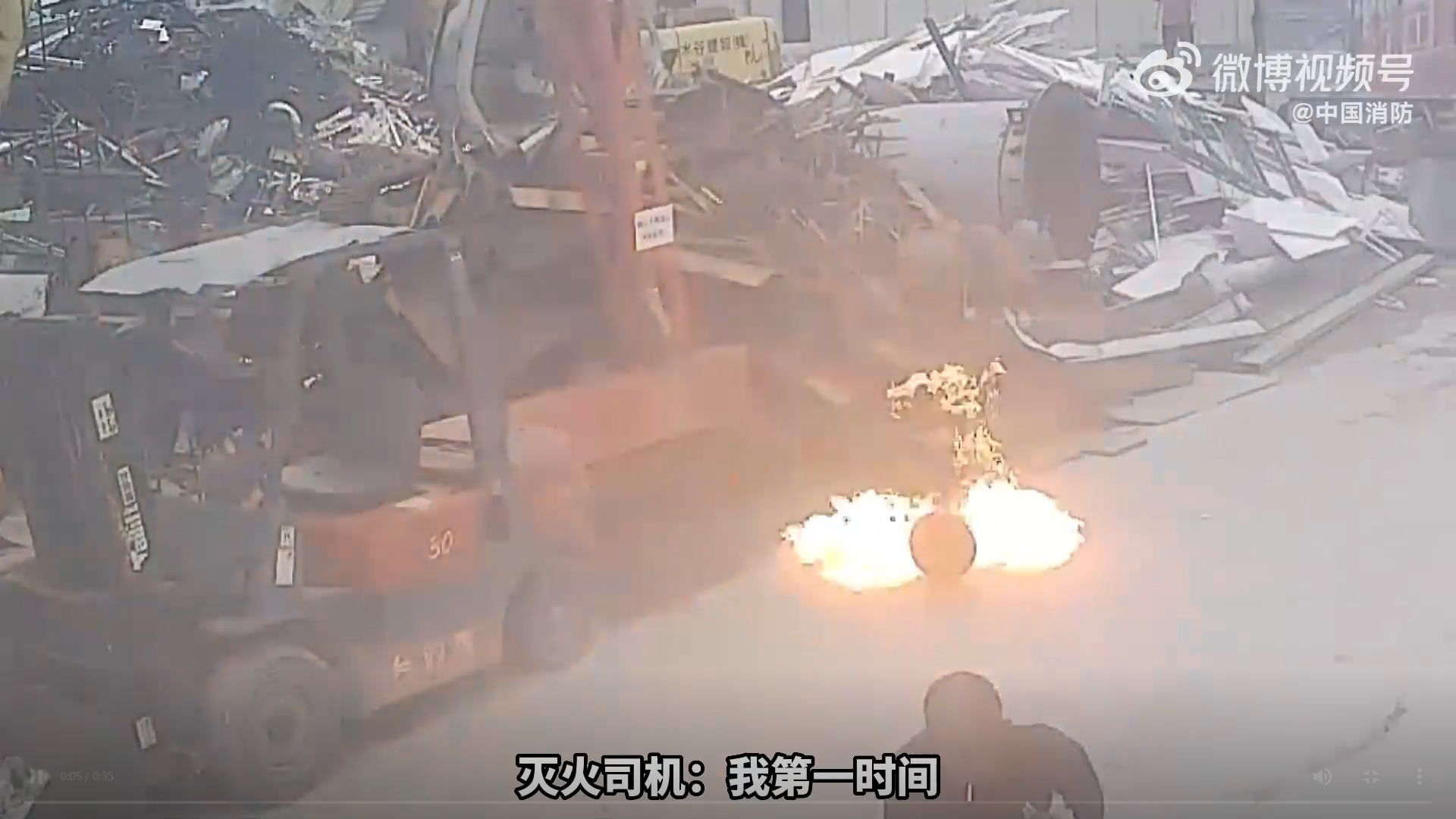 废铁场切割煤气罐起火,老板扔上马路